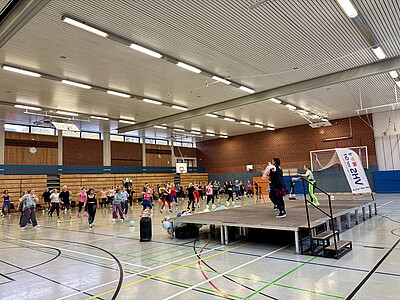 Über 100 Tanzbegeisterte nahmen am Samstag, 25. Oktober 2025 an der ersten ZUMBA®-Party unserer VHS vor Ort unter dem Motto „All you can dance“ in Büren teil. Drei Stunden lang wurde gemeinsam getanzt, gelacht und gefeiert – ein Nachmittag voller Energie, Musik und Bewegung. Das Trainer-Team mit Sabine, Stefan, Rimma, Tatiana und Irina sorgte mit ansteckender Begeisterung, abwechslungsreichen Choreografien und mehr als 60 mitreißenden Songs für beste Stimmung in der Turnhalle „Alte Schanze“. Von Salsa und Reggaeton bis hin zu aktuellen Hits – das Programm bot für alle Teilnehmenden etwas, sodass niemand lange stillstehen blieb.